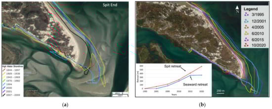 The sand eroded from Castle Neck’s Southern Spit enters Essex Inlet and Essex Bay, where it is redistributed by waves and tidal currents. The presence of scarps and a history of relative shoreline stability to modest erosion along the southern, backbarrier shoreline of Castle Neck (Figure 10b and Figure 11) indicate that little, if any, of the sand is transported to the backside of the spit. Furthermore, although sand is likely moved onshore and offshore in the main channel of Essex Inlet, little of this sand is deposited permanently on the ebb-tidal delta. There is no evidence that the ebb-tidal delta has expanded during recent time because it has reached an equilibrium size and volume as dictated by its tidal prism []. It is not possible to account for the final disposition of all the sand washed into Essex Bay, as it likely experiences widespread dispersal.
