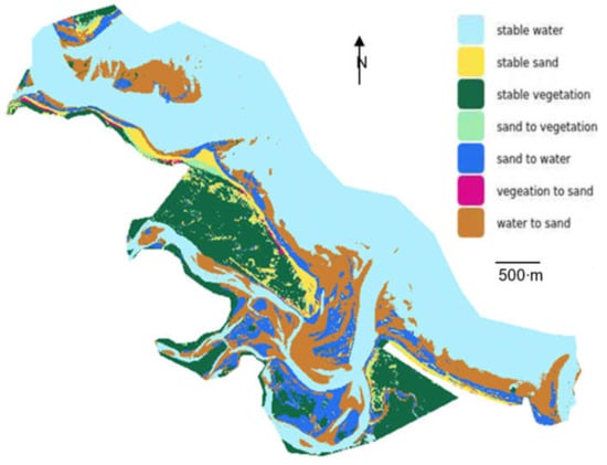 Changes in the morphological setting of Castle Neck between 2017 and 2019 have been mapped using the machine learning decision tree algorithm [], available in the open software suite BEEODA []. The method was applied to an image composite obtained from two 4-band multispectral orthorectified scenes from PlanetScope [], and the following spectral indexes: normalized difference vegetation index (NDVI) to highlight vegetation []; normalized difference water index (NDWIGreen/NIR) to highlight standing water bodies, especially in channels []; and optimized soil adjusted vegetation index (OSAVI) to highlight bare soil, including sand and mudflats proximal to channels []. Seven classes were identified: three stable classes (water, sand, and vegetation) and four “change classes”, which incorporate the conversion of water to sand, sand to water, vegetation to sand, and sand to vegetation. The accuracy assessment and area estimates were obtained following the approach of [,].
