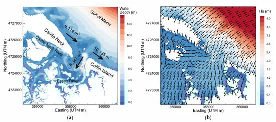 The backbarriers of Plum Island and Castle Neck are dominated by shallow lagoons floored by ubiquitous intertidal and subtidal sand bodies (Figure 1b). Mean depth along the thalweg gradually deepens from <2 m proximal to the upper estuary to >10 m at the PIS Inlet throat (Figure 1b). The backbarrier of Essex comprises approximately 24 km2 and is bounded by bedrock and glacial uplands. Generally, open-water areas (at high tide) increase substantively toward inlet entrances. This region experiences semi-diurnal tides with a mean range of 2.8 m, increasing to more than 3.7 m during perigean spring tidal conditions []. The backbarrier spring tidal prism of PIS Inlet and Essex Inlet is 32 × 106 m3 [] and 30 × 106 m3 [], respectively.