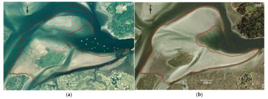 Morphology of the inner flood-tidal delta (outlined in red) in (a) 2007 (U.S. Geological Survey) and (b) 2016 (Landsat Copernicus). During this interval, the delta volume increased by approximately 185,000 m3.