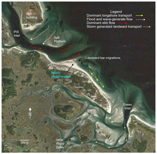 Advances in numerical modeling and field-data acquisition, coupled with greater spatial and temporal resolution of satellite and other aerial photographic platforms, are allowing us to better document past subannual to multidecadal coastal change and project future evolution. Moreover, these tools can be used to investigate the effects of increased rates of sand supply to inlets and associated configurational changes of adjacent ebb-tidal deltas, alterations of the backbarrier hypsometry, and ensuing changes to the inlet hydraulics. However, the output from these modeling efforts benefit from a detailed knowledge of the existing sand-transport pathways. In addition, although the basic patterns of sand dispersal at tidal inlets are well-documented [,,,,,,] and mechanisms of inlet bypassing are well-defined [,,,], the sequential sequestration and connectivity of the pathways are less well understood [].