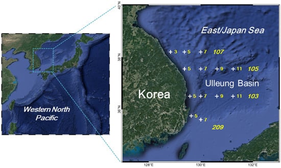 Pelagic fish egg sampling stations in the East/Japan Sea, 2019–2021. Numbers with plus marks, station name; italic number, station lines. The base map is a Google Satellite map drawn using QGIS [] through the XYZ Tiles tool (https://mt1.google.com/vt/lyrs=s&x={x}&y={y}&z={z}, accessed on 10 March 2022).