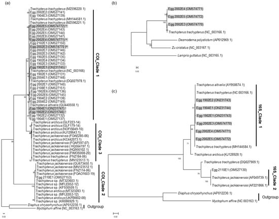 Maximum likelihood (ML) tree constructed using mitochondrial DNA sequences of pelagic fish eggs, Trachipterus species, and outgroups. (a) COI ML tree (based on the HKY + G + I model) including COI sequences from 25 eggs. Sequences of eggs with superscripts (bc, c) were also analyzed in the trees in (b,c). (b) Thirteen protein-coding genes and two rRNA genes ML tree (based on the GTR + G + I model), including concatenated sequences from the three eggs. (c) 16S rRNA ML tree (based on the K2 + G model), including 16S rRNA sequences from seven eggs. Bootstrap values (1000 replicates) over 50% are shown on the branches. Sequences shaded in gray were obtained using shotgun sequencing.