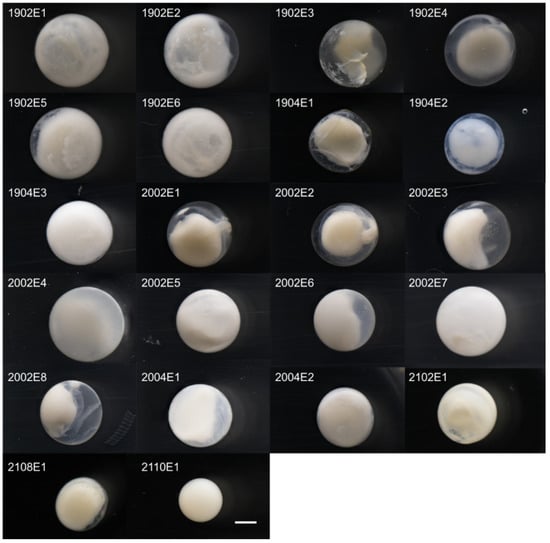 Pelagic eggs of two Trachipterus species preserved in 95% ethanol. 1902E1–2108E1, T. trachypterus; 2110E1, T. jacksonensis. Scale bar, 1.0 mm.
