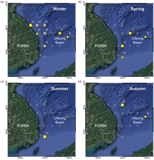 Distributions of pelagic eggs of two Trachipterus species for the four seasons: (a) winter, (b) spring, (c) summer, and (d) autumn. Tt, T. trachypterus; Tj, T. jacksonensis; Sampling year of Trachipterus eggs: filled circle, 2019; fisheye, 2019 and 2020; filled triangle, 2020; filled square, 2021 of this study; filled diamond, 2017–2019 of Shin et al. []; no egg detection: cross, this study; empty diamond, Shin et al. [].