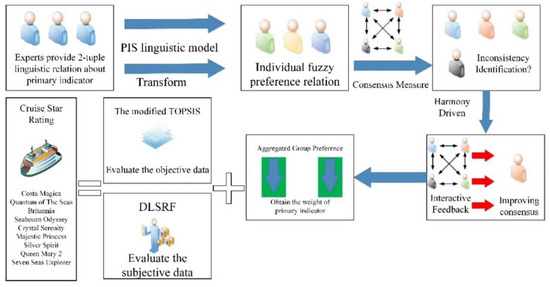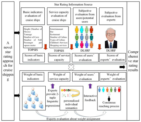 This section constructs a novel star rating index system for luxury cruise ships and chooses nine luxury cruise ships as research objects, namely Costa Magica, Quantum of The Seas, Britannia, Seabourn Odyssey, Crystal Serenity, Majestic Princess, Silver Spirit, Queen Mary 2 and Seven Seas Explorer. The proposed star rating index system includes the four primary indicators mentioned in Section 1, which is shown as Figure 1. Firstly, the weights of four parts are obtained based on interactive consensus and evaluations of experts under 2-tuple linguistic. Secondly, this section determines a star rating system of basic indicators and service capacity for the cruise ship based on TOPSIS and some research data is presented including the ships’ tonnage, height, number of crew, full passenger number, ships’ cabins number, category, type and maximum area. Thirdly, it provides the star rating from experts and users/potential users by DLSRF. Finally, comprehensive star rating results are generated. In order to ensure the integrity of the proposed method, Figure 2 is embedded in this article to link or weave different techniques.