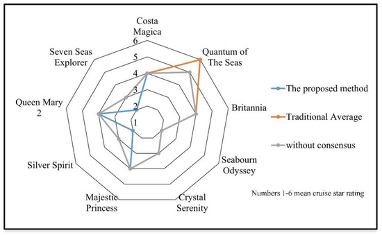 On the other hand, a comparison analysis is presented to verify the effect of interactive group consensus process and PIS linguistic model on cruise star rating. It measures the generated weight and cruise star rating results under the condition of average weight and no consensus mechanism, respectively. The comparison results are shown in Table 14 and Figure 3, which finds that weights obtained based on expert evaluations tend to assign more weights to the fourth primary indicator, users’ evaluations to cruise ships. When the consensus among experts assigning weights is not reached, the second primary indicator, service capacity of cruise ships, is also assigned more weight, while the more weight is transferred into the fourth primary indicator, users’ evaluations to cruise ships, after reaching consensus. Furthermore, the cruise star rating results by different methods are relatively stable based on Figure 3.