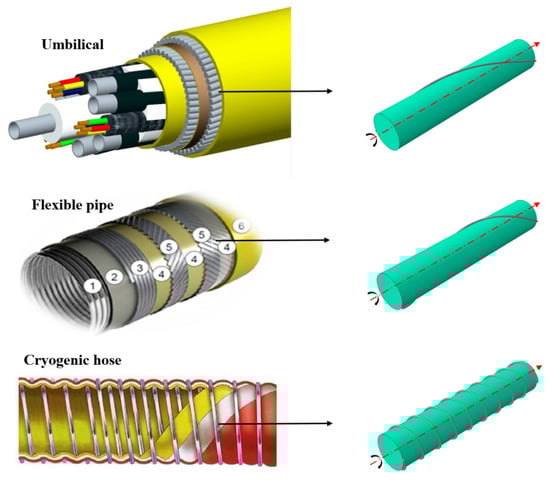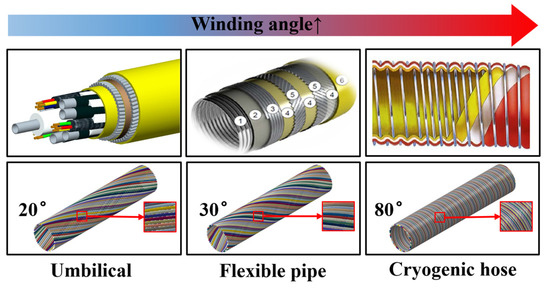 The winding angles of helically wound structures in the engineering field are not all small or large, and structures with intermediate winding angles have been applied in some fields. The various types of helically wound armored or braided layers have been used in marine devices such as umbilicals, flexible pipes and cryogenic hoses, as shown in Figure 10. The winding angles of 20°, 30° and 80° are used for different functions.