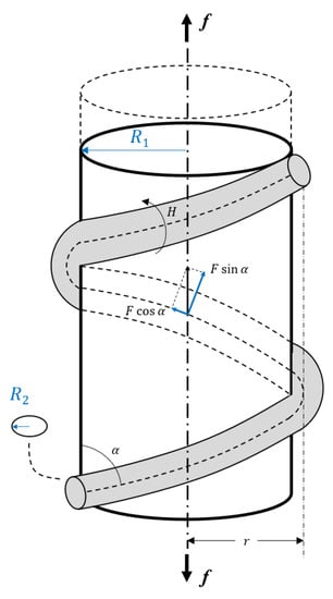 The length of the helically wound structure before stretching is L, and after stretching, the length becomes L(1 + ). Therefore, Equation (1) can be rewritten as: