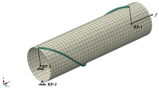 Considering the axial periodicity of the helically wound structure, a proper way to apply loads on the ends is required for various loading conditions. An improper method may lead to an undesired displacement and a stress concentration. Therefore, we compared the mechanical property of different numerical models. The degrees of freedom of all points on the ending surface were respectively coupled with the ones of the central points as reference points RP-1 and RP-2. Shell elements were defined as rigid elements and were completely fixed with RP-2, and a displacement load with the amplitude of a thousandth the length of the pitch was applied to the RP-1. The loading and constraint conditions are shown in Figure 5. The quasi-static loading condition was applied to smooth the analysis step and avoid sudden stress generation. Because of the axial periodicity of the structure, the internal force and stress changed periodically. Therefore, the model with the length of a pitch was taken to conduct the numerical calculation.