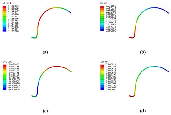 Finite element cloud map. (a) Axial tension, (b) stretch, (c) bending, (d) torsion.