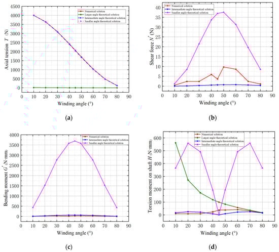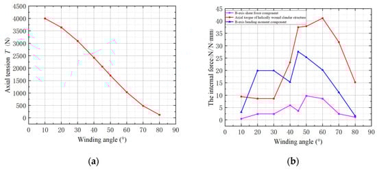 Numerical solutions of internal forces at different winding angles. (a) Axial tension, (b) other internal forces.