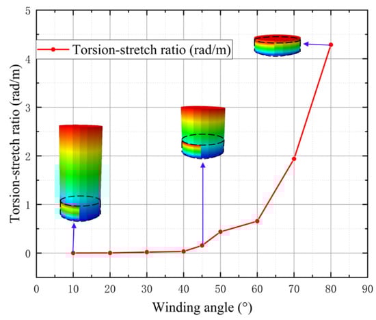 Based on the simulation, the tensile force and stress of the helically wound structure increased linearly with the increasing winding angle. Another interesting behavior is that other internal forces and stresses may reach a peak when the winding angle reaches 45°. Therefore, a micro-element analysis method was applied to conduct a study on the symmetry of the mechanical behavior of the helically wound slender structure. When the winding angle increased, the torsion–stretch ratio changed, as shown in Figure 8. The cloud image was a torsion cloud image. The dotted line shows the undeformed state. As the winding angle increased, the torsional strain gradually increased and the stretching strain gradually decreased. When the winding angle was 45 degrees, the torsion–stretch ratio tended to the middle value. Both the torsional and tensile deformations were large, so the internal force and stress tended to the maximum when the winding angle was 45°.