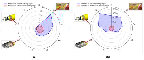 - Under the premise of the same axial strain, the tensile–torsion ratio of different winding angles was analyzed. It was found that with the increase of winding angle, the torsion of the structure gradually replaced the stretch, leading to increased error, so the effect of torsion should be fully considered.