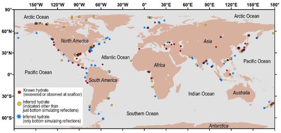 - Waite, W.F.; Ruppel, C.D.; Boze, L.-G.; Lorenson, T.D.; Buczkowski, B.J.; McMullen, K.Y.; Kvenvolden, K.A. Preliminary Global Database of Known and Inferred Gas Hydrate Locations; U.S. Geological Survey, Coastal and Marine Hazards and Resources Program: Woods Hole, MA, USA, 2020.