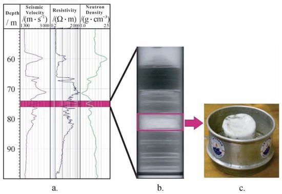The above described relatively low resistivity anomaly range indicates the presence of pore filling gas hydrate. For the massive gas hydrate reservoir, the resistivity increase was much higher. GMGS2 focused on the continental slope of the northeast Pearl River Mouth Basin, and massive, layered, vein, and dispersed gas hydrates were found in five coring sites [37,40]. The downhole logging data from the W08 well and core samples from the same site confirmed the existence of massive gas hydrate (Figure 4), and the logging data at the depth of 66 to 98 mbsf indicated that the maximum value was more than 2000 Ω·m.