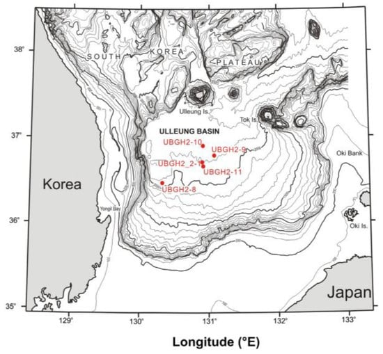Located on the eastern edge of the Eurasian plate, Ulleung basin is a continental back-arc basin with many block-migration deposits growth. Natural gas hydrate mainly exists in the sandy turbidite layer, which occurs in argillaceous deposits or as vain and fracture-filled. South Korea conducted two gas hydrate expeditions in the Ulleung Basin in 2007 and 2010 (Figure 7) [50].