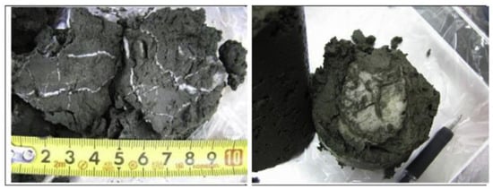 During these expeditions, both vein-filling gas hydrates and pore-filling gas hydrate existed in the reservoir [52]. The resistivity data was acquired by LWD operations [51]. The LWD-tool string (provided by Schlumberger) contained the GeoVision (electrical imaging), EsoScope (propagation resistivity, bulk density, and neutron porosity), TeleScope, and Sonic Vision tools. Here the ring-resistivity log values acquired by the GeoVision were used. The downhole resistivity log data from Sites UBGH1-9 and UBGH1-10 as an example, there were pronounced increases in resistivity log values above the BSR. In UBGH1-9, the resistivity values of the gas hydrates layer increased to over 12 Ω·m and greater values were higher than 80 Ω·m at UBGH1-10. The values seen in these two logs were significantly higher than the unconsolidated sediments of the East Japan Sea [53,54], with an average value of 0.8 Ω·m. These high anomaly resistivity data not only indicate the existence of gas hydrate but also suggest the different types of occurrences. The morphologies of massive or fracture filling hydrate usually are vein, nodule, or lamina (Figure 8) [54], resulting in a high degree of anisotropy, and the resistivity is extremely high.