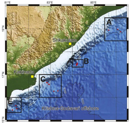 The Krishna–Godavari Basin was formed along the rifted eastern continental margin of India, the offshore K-G Basin is considered a potential gas hydrate province [55]. The Ministry of Petroleum and Natural Gas began the National Gas Hydrates Program (NGHP) in 1997 and implemented NGHP-01 and NGHP-02 in the year 2006 and 2015 [56]. NGHP-01 investigated 21 sites in total, including 12 boreholes for logging while drilling (LWD) and 13 boreholes for wireline logging (WL). NGHP-02 collected LWD and sediment core data in Area B & C offshore of eastern India (Figure 9), to investigate controls on the distribution and peak saturation of methane gas hydrate occurrences in the buried channel, levee, and fan deposits [57].