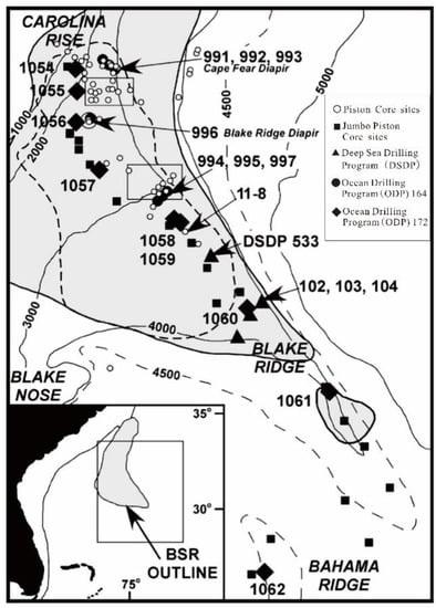 The Blake Ridge is a positive topographic sedimentary feature on the continental slope. The crest of the ridge extends to the general trend of the continental rise from water depths of 2000 to 4800 m. The thickness of the gas hydrate stability zone ranges from zero along the northwestern edge of the continental shelf to a maximum thickness of about 700 m along the eastern edge of the Blake Ridge (Figure 10) [59].