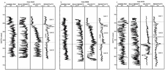 Downhole log data from Hole 994D, 995B and 997B [60]. ((a) Downhole log data from Hole 994D, (b) Downhole log data from Hole 995B, (c) Downhole log data from Hole 997B).