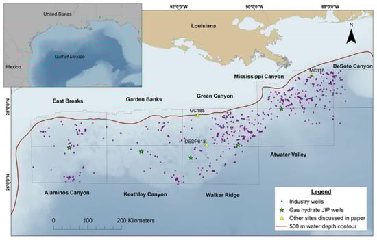 The Gulf of Mexico is a tectonically active and geologically complex environment characterized by faulting, folding, and other deformational processes that largely arise due to the layering of thick sedimentary sequences over buoyant salt deposits [61]. It has been a major location for the exploration of oil and natural gas resources for decades. The first hydrate-focused drilling expedition in this area was the Chevron-led Gulf of Mexico Gas Hydrate Joint Industry Project (JIP) Leg I in 2005, which drilled and cored three sites to evaluate the sediment and borehole stability. During JIP Leg II in 2009, the LWD measurements were used to detect gas hydrate occurrences in sand reservoirs [61,62]. A total of seven holes were drilled at three sites and hydrate was identified in the Green Canyon and Walker Ridge sites in the sand and marine mud reservoirs. Figure 12 shows the 798 petroleum industry wells drilled in this area, including the gas hydrate JIP wells [63].