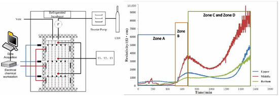 Relative to marine sediment pore water systems, resistivity measurements can also give good information on gas hydrate formation and dissociation processes. Chen et al. tested the resistivity changes during the gas hydrate formation process to analyze the response between gas hydrate distribution and resistivity in marine sediments (Figure 14) [76]. It could be seen that during the gas hydrate formation process, the resistivity experienced four stages of formation from stable to rapidly increasing then relatively decreasing resulting in an overall increase in the measured resistivity as shown in Figure 14. The controlling mechanism behind this phenomenon is a function of temperature, pressure, water saturation, salinity, and gas hydrate distribution.