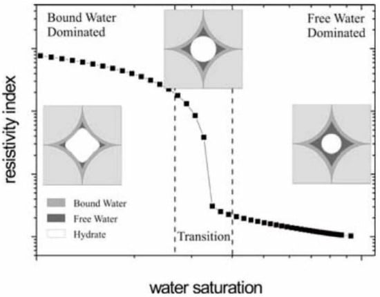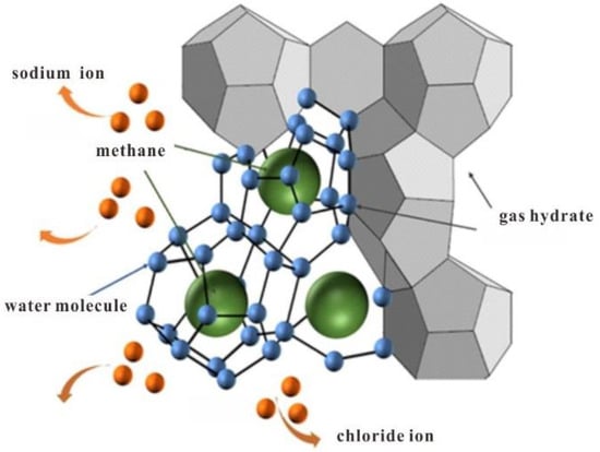 Gas hydrate formation consumes methane molecules and water molecules in pore solution, and salt ions are excluded by this process (Figure 15). Stimulated by the reaction heat, ion mobility is also accelerated. Therefore, even if the connectivity of pores become weak as the insulated hydrate crystal grows, the resistivity still shows a decreasing trend during the gas hydrate formation process [77]. However, with hydrate formation continuing, most of the pore water is replaced by solid hydrate, and the resistivity will continue to increase.