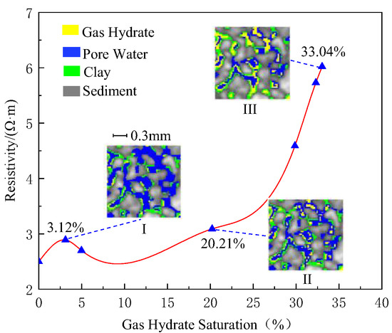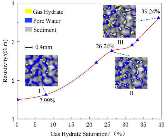 As gas hydrate saturation increased from 7.99% to 39.24%, and the resistivity increased from 1.63 Ω·m to 3.61 Ω·m. As shown in X-CT images of stage II and III, there were significant gas hydrate particles suspended in pore water, so the gas hydrate micro-distribution mode turned to the coexistence of contact and suspension. In this period, gas hydrate particles have a greater blocking effect on the pore water connection, which results in higher resistivity values. [81].