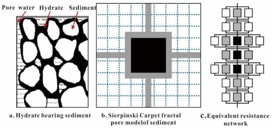 Simulation of electrical resistance of gas hydrate bearing sediments by fractal pore model [82]. (in (b,c), black stands for sediment particle, grey stands for pore water, white stands for gas hydrate).