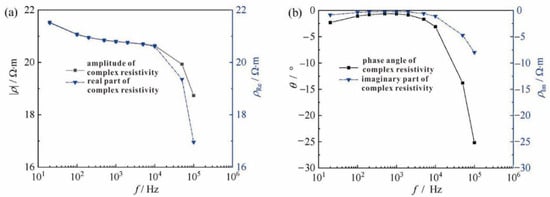 Frequency dispersion curves of complex resistivity parameters. (a) Amplitude and real part of the complex resistivity change with frequency; (b) Phase angle and imaginary part of complex resistivity change with frequency.