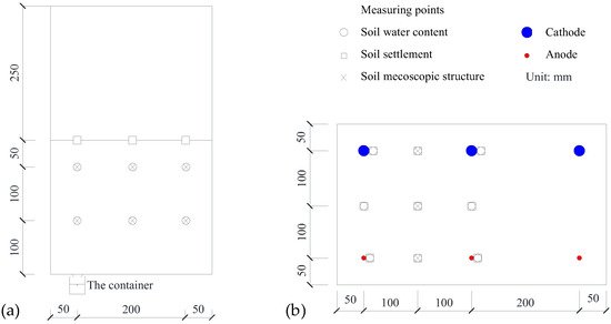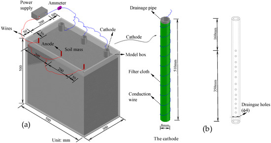 The schematic diagrams of the self-made model box are shown in Figure 1a. The model box is made of Plexiglas plates with a thickness of 10 mm. The box has inner dimensions of 500 mm length, 500 mm width and 300 mm height, and mainly serves as a container for the soil samples. Three holes are reserved on the bottom of the model box with a diameter of 20 mm. These holes are used to fix the cathodic electrodes. During the test, the water assembled in the cathodic areas flows through the cathodic electrodes and is collected in the container underneath the reserved holes of the model box.