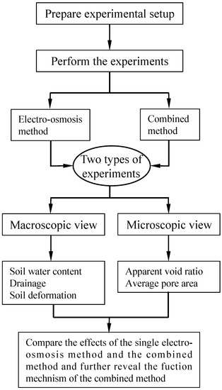 To clearly present the research methodology, a flowchart is shown in Figure 2. To be specific, two main tests, denoted by T1 and T2, were performed in this study to investigate the combined effect of preloading and electro-osmosis. T1 was conducted with a single electro-osmosis method and T2 using the combined method. Additionally, two control tests, numbered by C1 and C2, were also conducted. The initial soil water content of T1, T2, C1 and C2 were, respectively, 70.1%, 70.3%, 69.6% and 70.5%. A spd-3606 DC power supply was used to rectify alternating current to the direct current. An ammeter was connected in a series to monitor the total current. During the experiment, a total voltage of 25 V was used for both T1 and T2, which made a voltage gradient of 1.25 V/cm referencing voltage gradients of 0.32~2 V/cm in previous studies [12,16,26]. Moreover, a layer of fine sand with 100 mm in thickness was used and served as a surcharge load of 1.76 kPa referencing Hu et al. [26], which used similar devices and soils in the experiments.