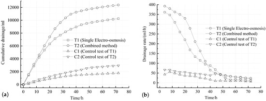 The cumulative discharge for T1, T2, C1 and C2 were shown in Figure 4. It can be seen from Figure 4 that the drainage volumes increase with the conduction time and T1 displays significantly higher discharges at each time node than the control test C1, as is the situation with T2. Specifically, the two lines for T1 and T2 are close for the first 0–8 h. After eight hours, the difference between the two lines increases and finally the total drainage volume of T2 is 20.8% higher than that of T1. This demonstrates the better dewatering effects of the combined method over the single electro-osmosis method. To further compare the dewatering effect of each method, drainage rates of each time node are calculated by dividing the drainage difference of the prior and next time node with duration. Figure 5 shows that the drainage rates of both T1 and T2 decreases with time and is much higher than that of C1 and C2. Moreover, the drainage rate of T2 is higher than that of T1 during 0–40 h, and after 40 h, the drainage rate of T1 and T2 are very close. The decrease in the drainage rate derives from multiple factors, which include the changes of the soil properties, and the loss of the potential on the interface of the electrodes and soil, the development of soil cracks, etc. The higher drainage rate of T2 demonstrates a better dewatering efficiency of the combined method over the single electro-osmotic technique. However, it is interesting that final drainage rates of T1 and T2 are quite close, with the difference being within 5%, despite the hugely varied soil states. Solid studies are needed to clarify the primary causes.