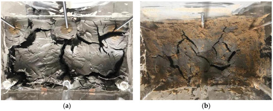 Soil cracks that developed during the tests: (a) The soil state after T1 test; (b) The soil state after T2 test.