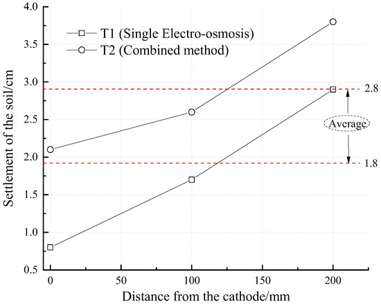 After the tests, the soil settlements were measured using rulers and the soil settlement distributions of T1 and T2 are shown in Figure 6. Figure 6 demonstrates significant in-homogeneity of the soil settlements for both T1 and T2. The final soil settlements increased from the cathodes towards the anodes. The settlements of T2 are higher than that of T1 for each section. Specifically, the average settlement of T2 is 34.5% higher than that of T1. Therefore, the combined method induced higher soil settlement than the single electro-osmosis technique.