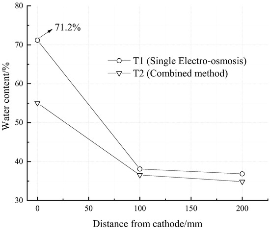 For each cross section of the soil, the average soil water content of the measuring points is used for analysis. Distributions of the soil water content of T1 and T2 are shown in Figure 7. It can be seen from Figure 7 that the soil water content decreased from the cathode to the anode and the water content of T2 is lower than that of T1 at each section. To be specific, the average water content of T2 is 15.6% lower than that of T1. Figure 7 also shows that the first data of T1 is higher than the initial soil water content of 70%. This can be caused when the water accumulated in the cathodic area was not drained out in a timely manner.