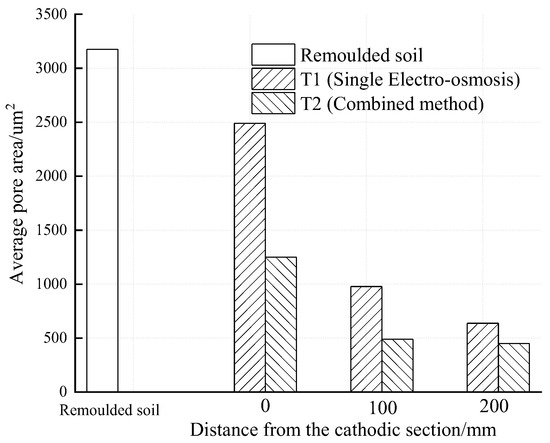 The average pore area can be used to analyze soil homogeneity. Figure 9 shows the soil average pore area distributions for T1 and T2. It can be observed from Figure 9 that the average pore areas of the treated soil are smaller than that of the remolded soil. Additionally, the average pore area of T2 is smaller than that of T1 at each section. This proves that the combined method resulted in a smaller average pore area compared with the single electro-osmosis method. In other words, the combined method or the surcharge can further compress the soil pores.