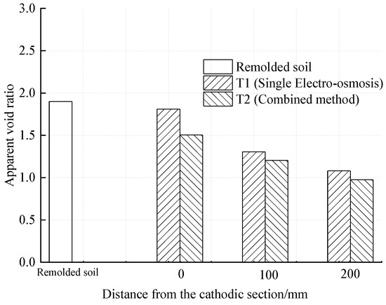 The apparent void ratio is normally used to quantitatively explore the soil pore structure characteristics. Apparent void ratios of the treated soils in T1 and T2 as well as the remolded soil samples are shown in Figure 10. It can be seen from Figure 10 that the apparent void ratio decreases from the cathode to the anode for each test. This is in accordance with the reduction in soil water content shown in Figure 7. Moreover, apparent void ratios of treated soil of T2 are smaller than that of T1, which is also smaller than that of the remolded soil. To be specific, the average soil void ratio of T2 is 13.8% lower than that of T1. Further analysis of the apparent void ratio is given in the discussion section that follows.