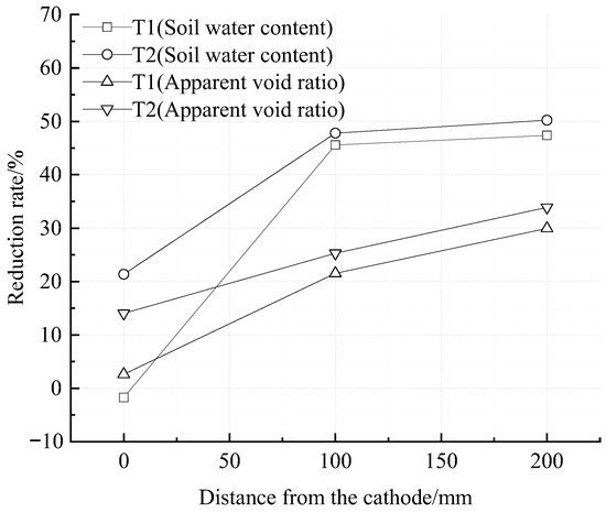 To compare the macroscopic and microscopic results, change rates of the test parameters (drainage, soil water content and apparent void ratio) are computed and discussed herein. From the above analysis, total drainage of T2 is 20.8% higher than that of T1, while the soil settlement of T2 is 34.5% higher than that of T1. Moreover, the reduction rates in soil water content and apparent void ratio are, respectively, displayed in Figure 11. Comparing T1 and T2, the reduction rates in soil water content or apparent void ratio for T1 are lower than that of T2, which demonstrates better strengthening effects of the combined method over the single electro-osmosis method. For each test as T1 or T2, reduction rates in soil water content are higher than that of the apparent void ratio.
