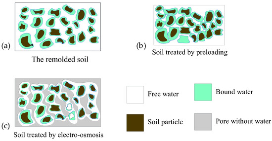 Effects of single electro-osmosis and preloading on the soil pore structure under ideal conditions: (a) The remolded soil; (b) Soil treated by preloading; (c) Soil treated by electro-osmosis.
