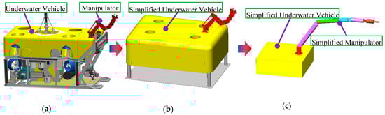 A model of a UVMS for fluid dynamics analysis is illustrated in Figure 1b. A geometric model of the underwater vehicle was simplified, but the mass and the displacement volume of the underwater vehicle remained unchanged. The position and the structure of the manipulator remained unchanged. Compared with a physical model, the model for fluid dynamics did not change the hydrodynamics performance of the manipulator, and the shape of the underwater vehicle was kept unchanged as much as possible. Therefore, model simplification for fluid dynamics analysis was reasonable.