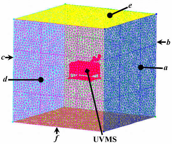The dimensions of the UVMS were: length mm, width mm, height mm. For the dimensions of the flow field domain, the length, the width and the height were the same, so that mm, and the boundary of the flow field was away from the UVMS. Each boundary panel, panel a, panel b, panel c, panel d, panel e and panel f could be used as the inlet boundary or outlet boundary of the flow field domain to simulate water flows in different directions. According to mesh independence verification, the minimum mesh size was set at 0.3 mm and the number of cells was 5,610,234.