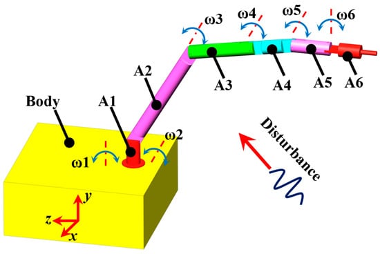A model of a UVMS for mechanism dynamics analysis is illustrated in Figure 1c. The appearance of UVMS was further simplified, but the relative position, the relative motion and the constraint relationship between the underwater vehicle and the manipulator remained unchanged, and was the same for each joint of the manipulator. Relative position, relative motion and constraint relationship are key factors affecting mechanism dynamics performance. Compared with the physical model, those factors were unchanged in the model for mechanism dynamics. Therefore, the model simplification for mechanism dynamics analysis was reasonable. In the mechanism dynamics analysis process, the dimension of the underwater vehicle has no effect and the size of underwater vehicle is reasonably reduced, giving the impression that the manipulator is too long.