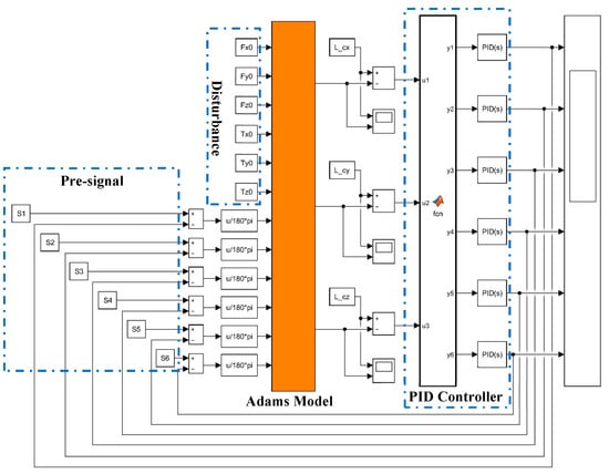 Most control schemes, such as the sliding mode control approach, are model based control schemes. In this study, considering the difficulties concerning establishment of a precise kinematics model and a dynamics model of the UVMS, a model-free control scheme was proposed. Fortunately, the PID control scheme, which has been widely used in a variety of applications [], is a typical model-free control scheme. Therefore, the PID control scheme was taken as a comparative scheme for trajectory tracking control of the UVMS. The PID based Simulink controller model is shown in Figure 4.