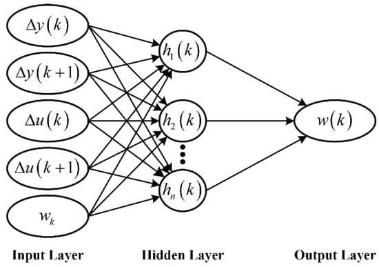 To further improve the motion trajectory tracking accuracy, a radial basis function neural network was embedded into the MFAC control scheme. The RBFNN control scheme was used to predict the value of the pseudo-partial derivative . The topology structure of the RBFNN is shown in Figure 8.