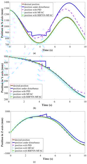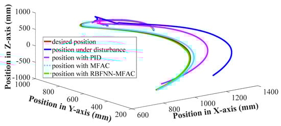 Therefore, in terms of position tracking accuracy, with PID was 82.4 mm, with MFAC was 26.2 mm, and with RBFNN-MFAC was 8.9 mm. The position tracking accuracy of MFAC was 68.1% better than that of PID, and the position tracking accuracy of RBFNN-MFAC was 66.3% better than that of MFAC.