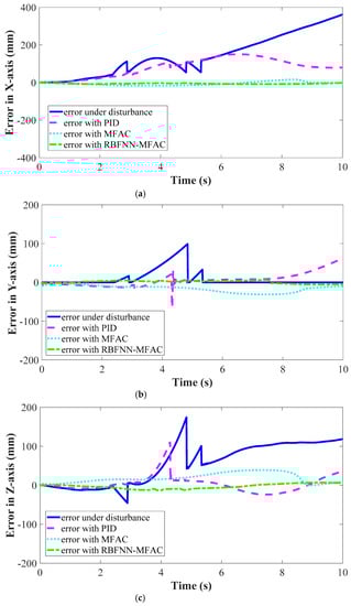 Position Tracking Error along Various Axes of Cartesian Coordinates. (a) Position Tracking Error along x Axis; (: average error with PID is 80.1 mm, average error with MFAC is 9.3 mm, average error with RBFNN-MFAC is 5.8 mm). (b) Position Tracking Error along y Axis; (: average error when PID is 12.9 mm, average error with MFAC is 15.9 mm, average error with RBFNN-MFAC is 3.5 mm). (c) Position Tracking Error along z Axis; (: average error when PID is 14.2 mm, average error with MFAC is 18.7 mm, average error with RBFNN-MFAC is 5.7 mm).