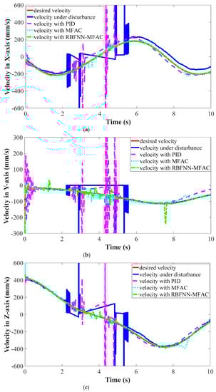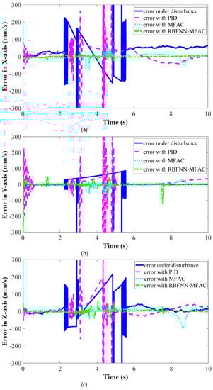 Speed Tracking Error along Various Axes of Cartesian Coordinates. (a) Speed Tracking Error along x Axis; (: average error with PID is 39.4 mm/s, average error with MFAC is 8.0 mm/s, average error with RBFNN-MFAC is 3.4 mm/s). (b) Speed Tracking Error along y Axis; (: average error when PID is 49.4 mm/s, average error with MFAC is 7.2 mm/s, average error with RBFNN-MFAC is 5.2 mm/s). (c) Speed Tracking Error along z Axis; (: average error with PID is 41.3 mm/s, average error when MFAC is 9.5 mm/s, and the average error with RBFNN-MFAC is 5.3 mm/s).