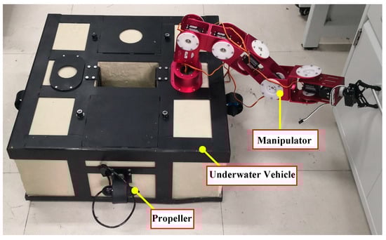 The underwater vehicle subsystem has a length of 600 mm, a width of 600 mm and a height of 250 mm. The total length of the manipulator subsystem is about 500 mm. The underwater vehicle has four propellers in the horizontal direction and two propellers in the vertical direction. The manipulator is driven by waterproof motors to ensure that the UVMS can work underwater.